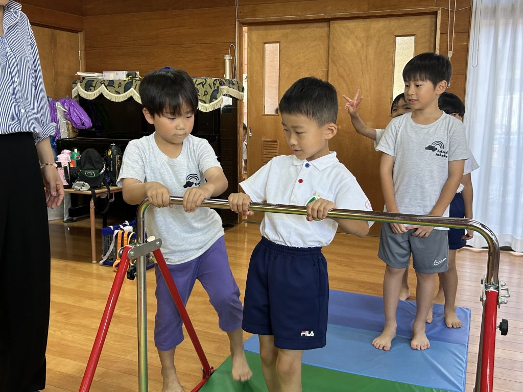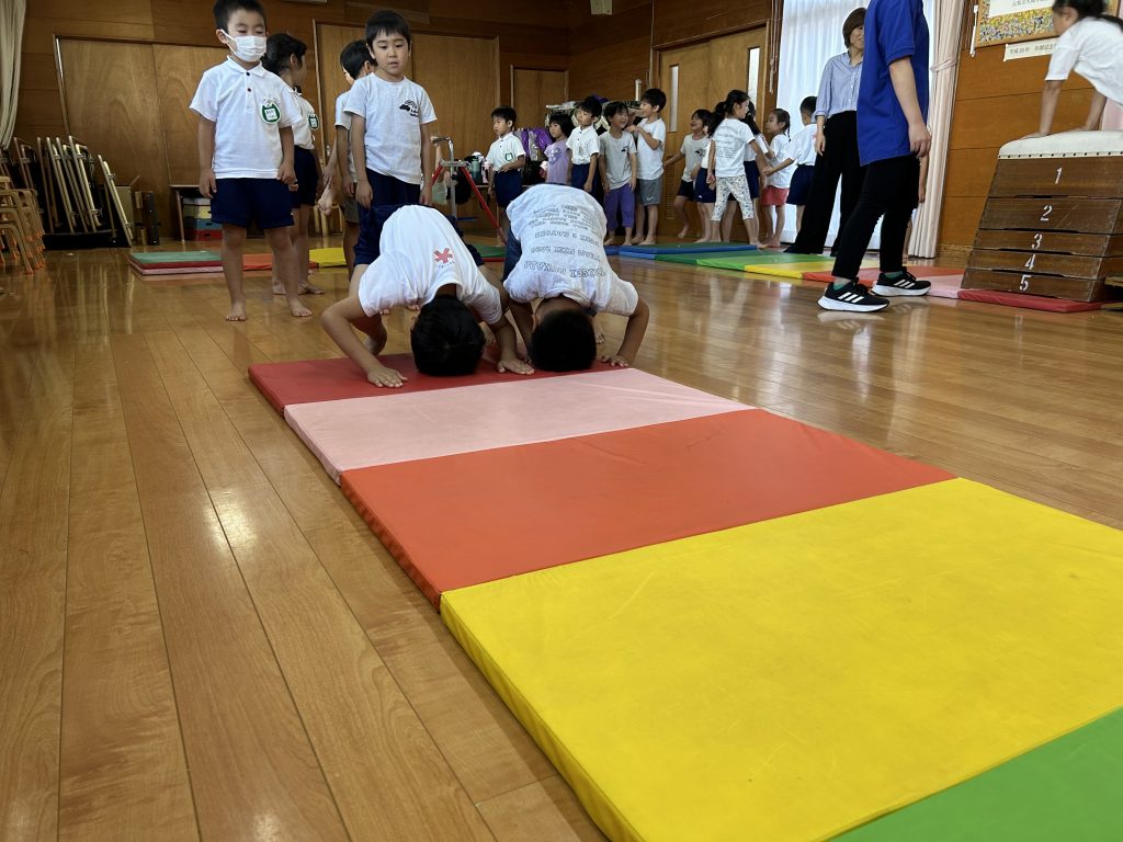 そして実際に、一年生と年長さんでペアになり跳び箱・鉄棒・マットを教えてもらいました✨「頭をちゃんとマットにつけるんだよ」「手に力を入れてしっかり握るよ」と一つひとつ丁寧に教えてくれました。