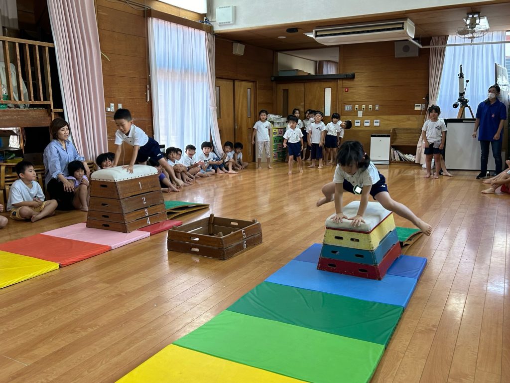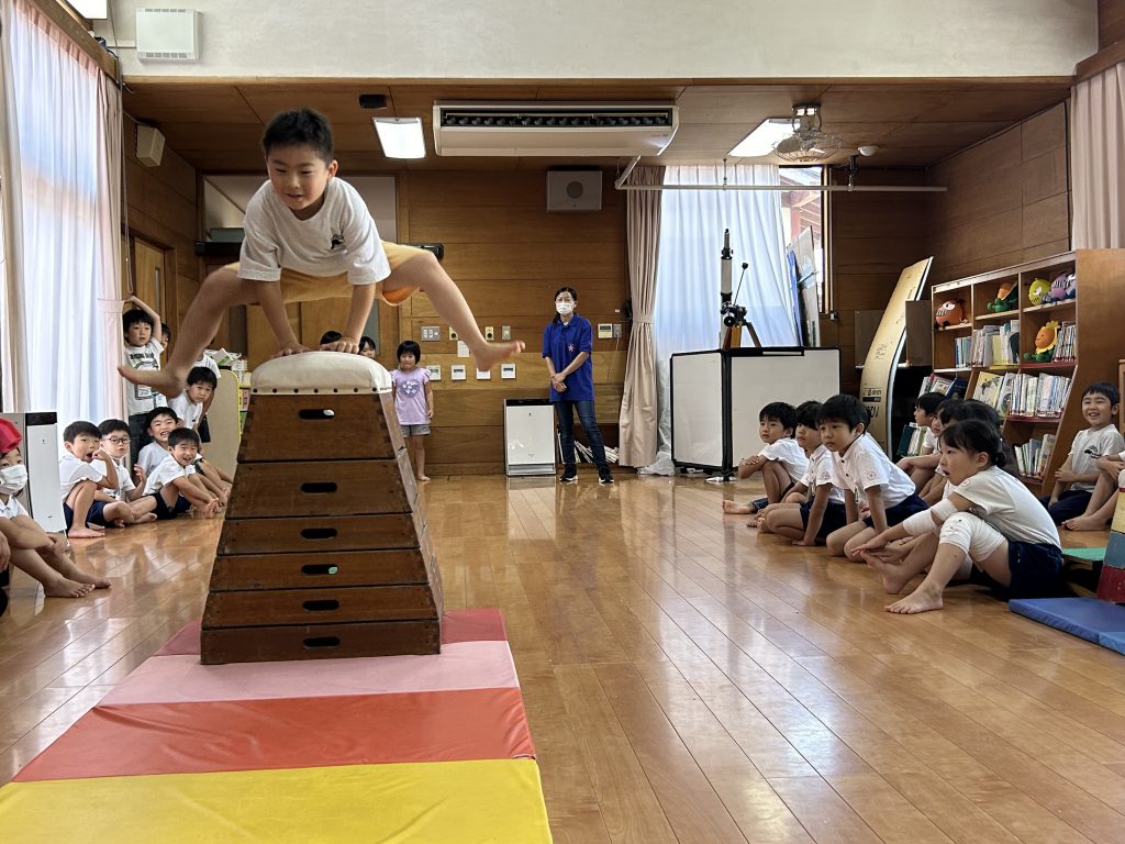 短い時間でも、一年生に教えてもらってできるようになったことが増えてきた年長さん!最後は皆んなで発表会をしました。去年のスポーツフェスティバルのように跳び箱を華麗に跳ぶ一年生の姿に年長さんもくぎ付け!!憧れの気持ちと“できるようになりたい”という意欲が高まりました。