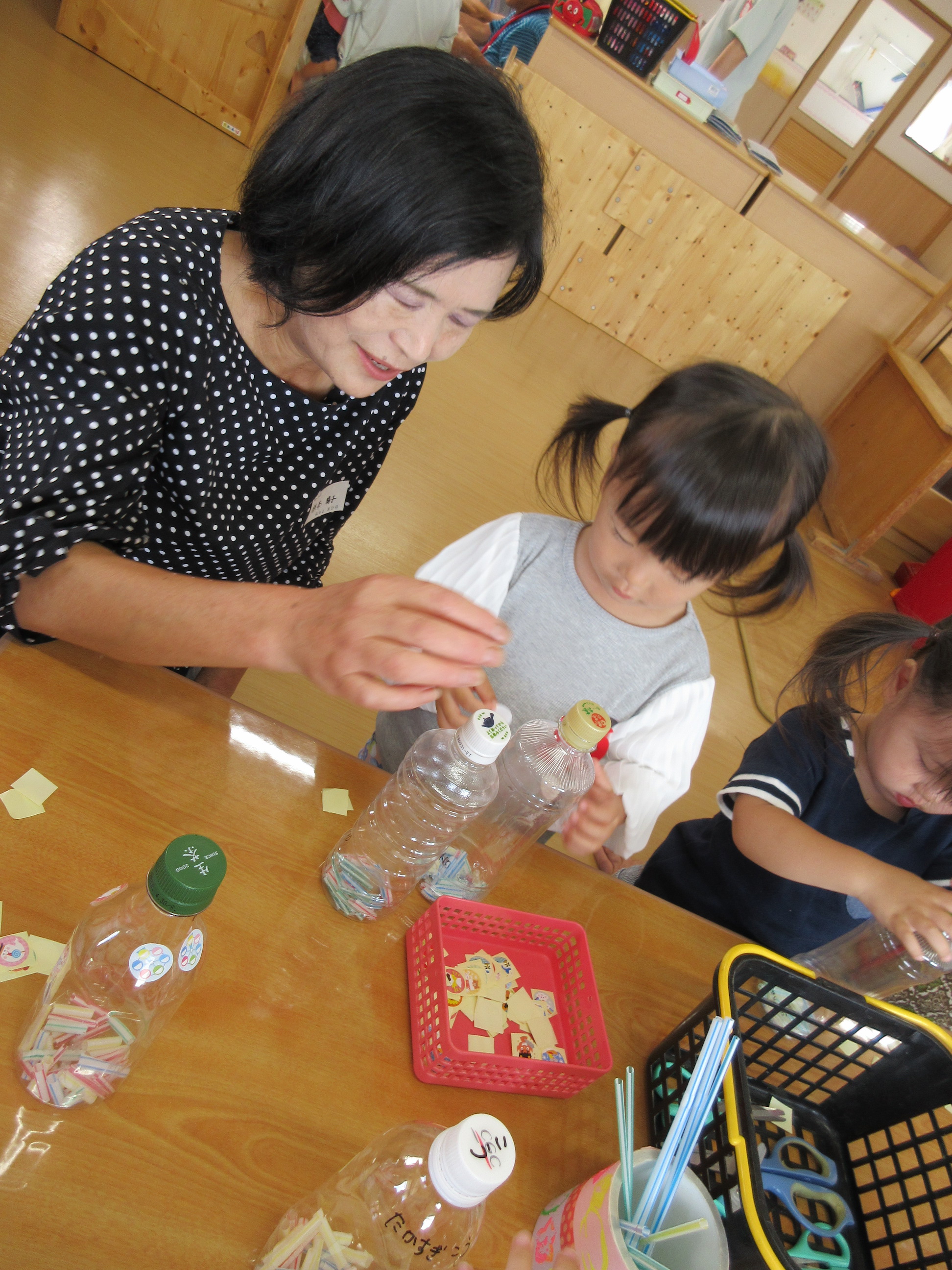 ストローを切って、子どもたちがシールをペタペタ貼っていきました。