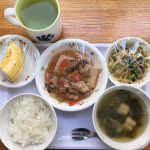 ご飯・味噌汁(かぶ・小松菜・麩)・肉豆腐・ラーメンサラダ・バナナ・麦茶
