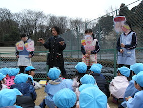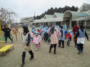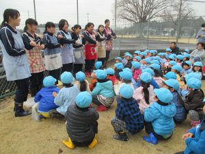 短大の海野先生と学生さんたちが幼稚園まで迎えにきてくれました。
