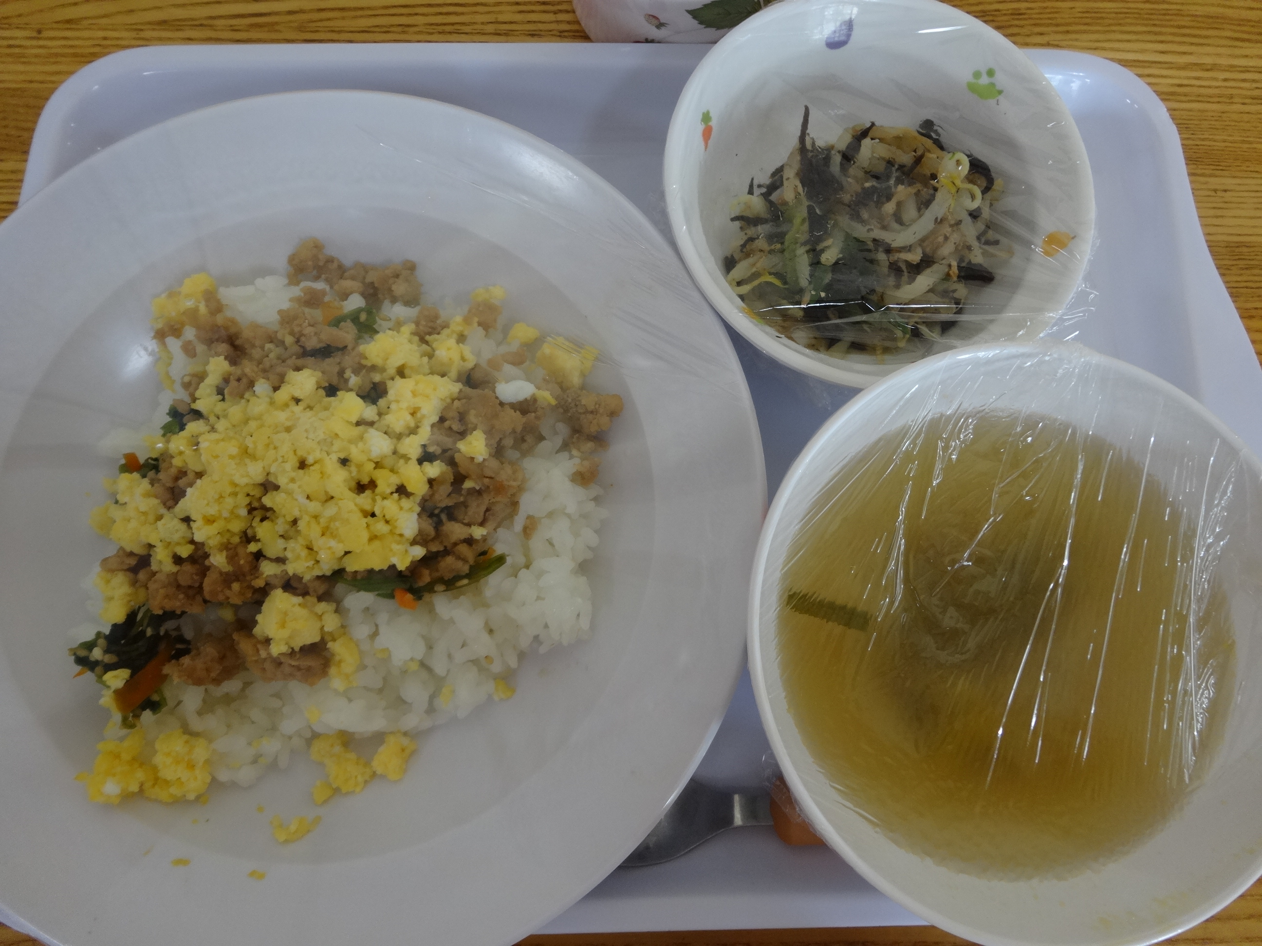 ビビンパ丼・白菜スープ(白菜・ニラ・干し椎茸)・もやしとツナの和え物・麦茶