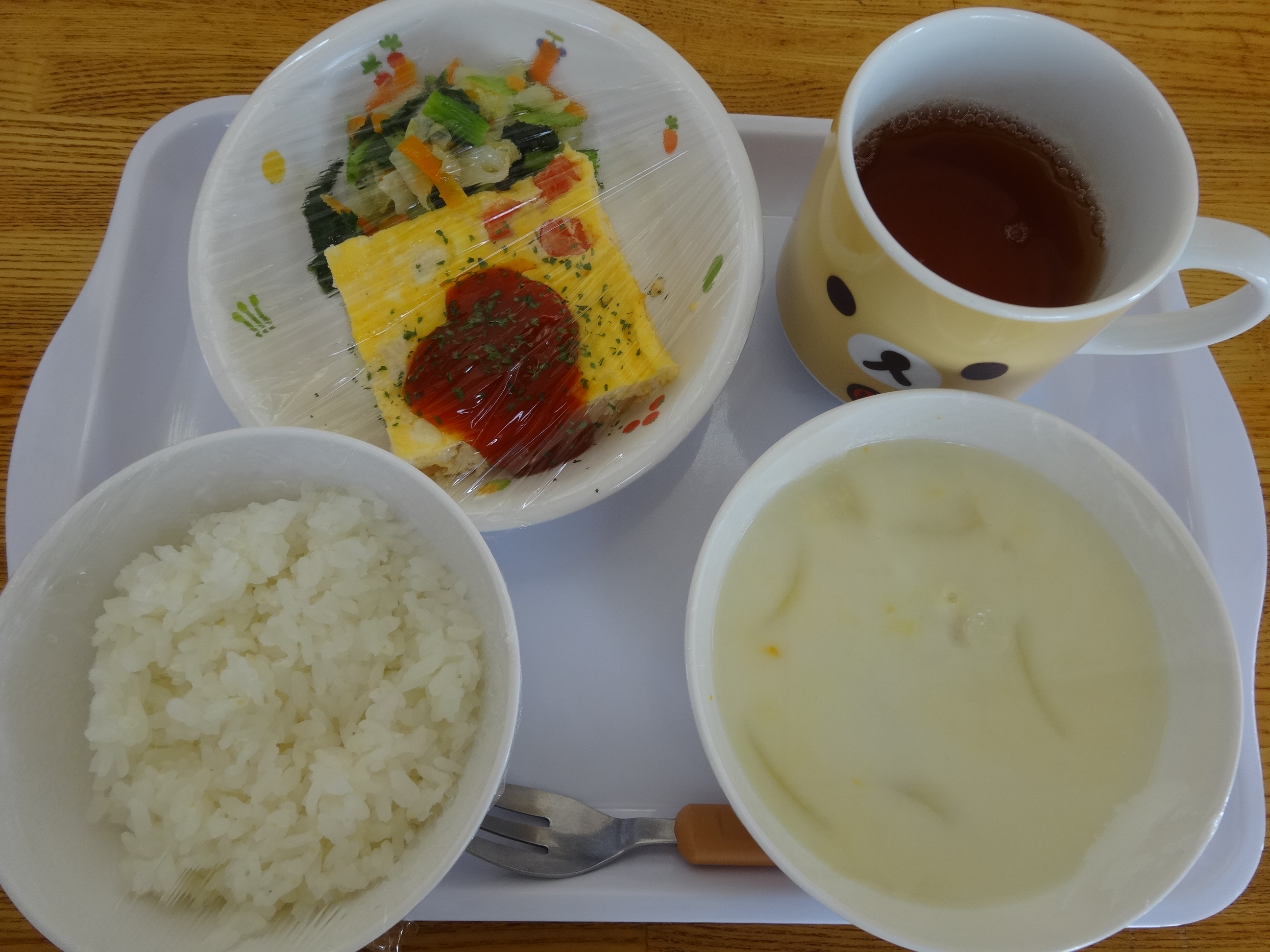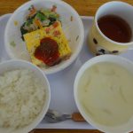 ご飯・クリームスープ(かぼちゃ・玉ねぎ・コーン)・スパニッシュオムレツ・野菜炒め・麦茶