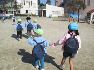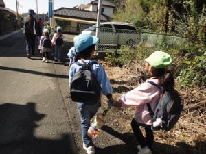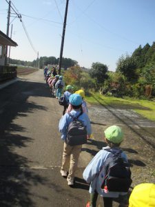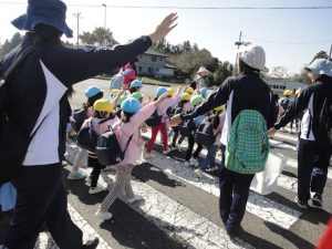 道路は一列になって,横断歩道は右左を見て,手を挙げて渡ったりと,車に気をつけて歩いて行きました。