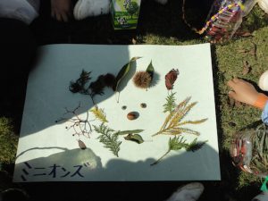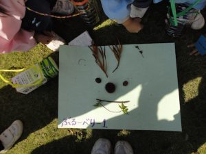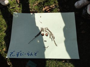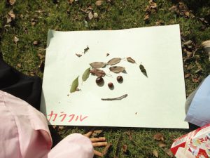 グループの友だちと集めた木の実や落ち葉を使って,絵を描きました。