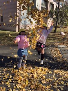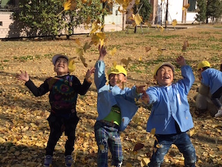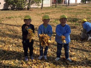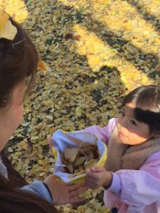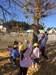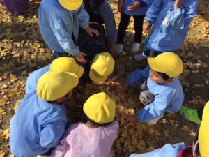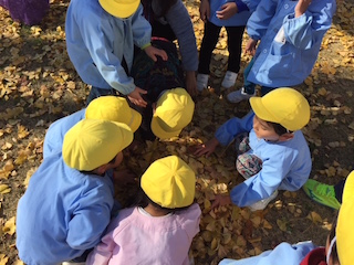 お天気が良い中,みんなで短大に散歩にいきました。いちょうの木の葉が落ち,黄色い絨毯のようになっている様子を見て,「きれーい」と歓声があがりました。