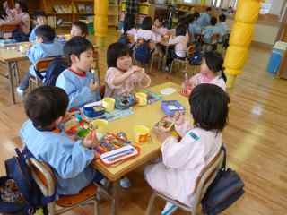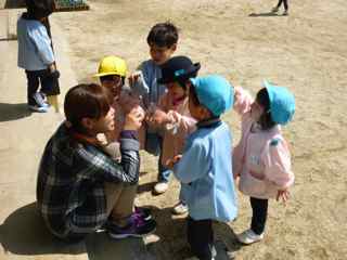 スクールバスから降りると、新しい子の手をつなぎながら、お部屋まで連れていく姿や着替えのお手伝いに向う姿が見られていました。年中組は同じクラスの友達との遊びに夢中です。今日は、天気も良く幼稚園の園庭は楽しい遊びが沢山広がっていました。「あぶくたったにえたった………おうちの鍵をしめてガチャガチャ……」先生と友達と触れ合いながら、心が弾みます。
