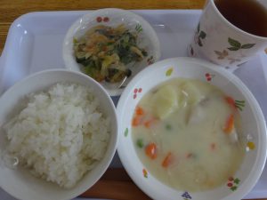 ごはん・クリームシチュー・大根とツナの和え物・麦茶