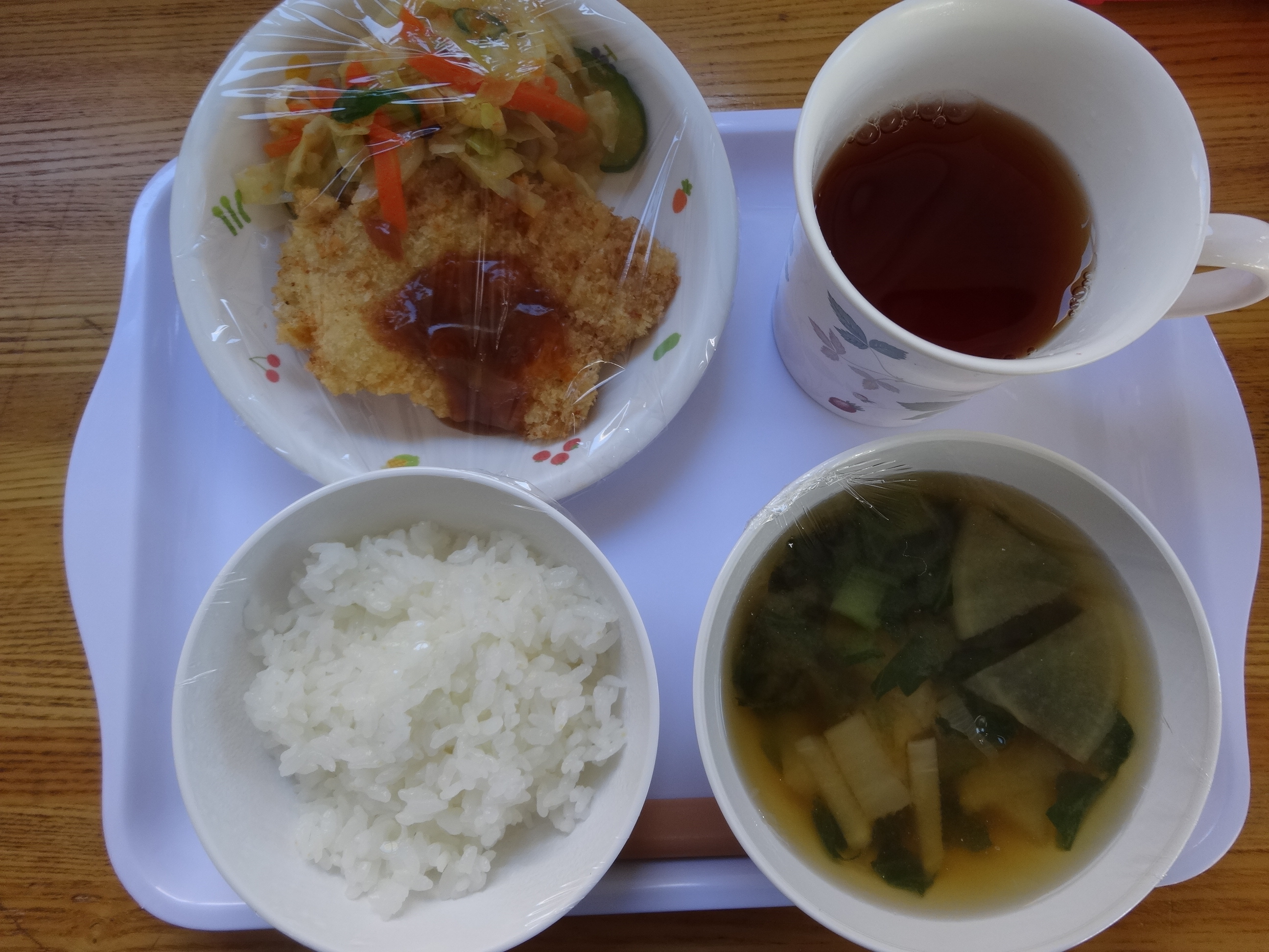 ごはん・味噌汁(大根・小松菜・ねぎ)・チキンカツレツ・キャベツの人参ドレッシングかけ・麦茶