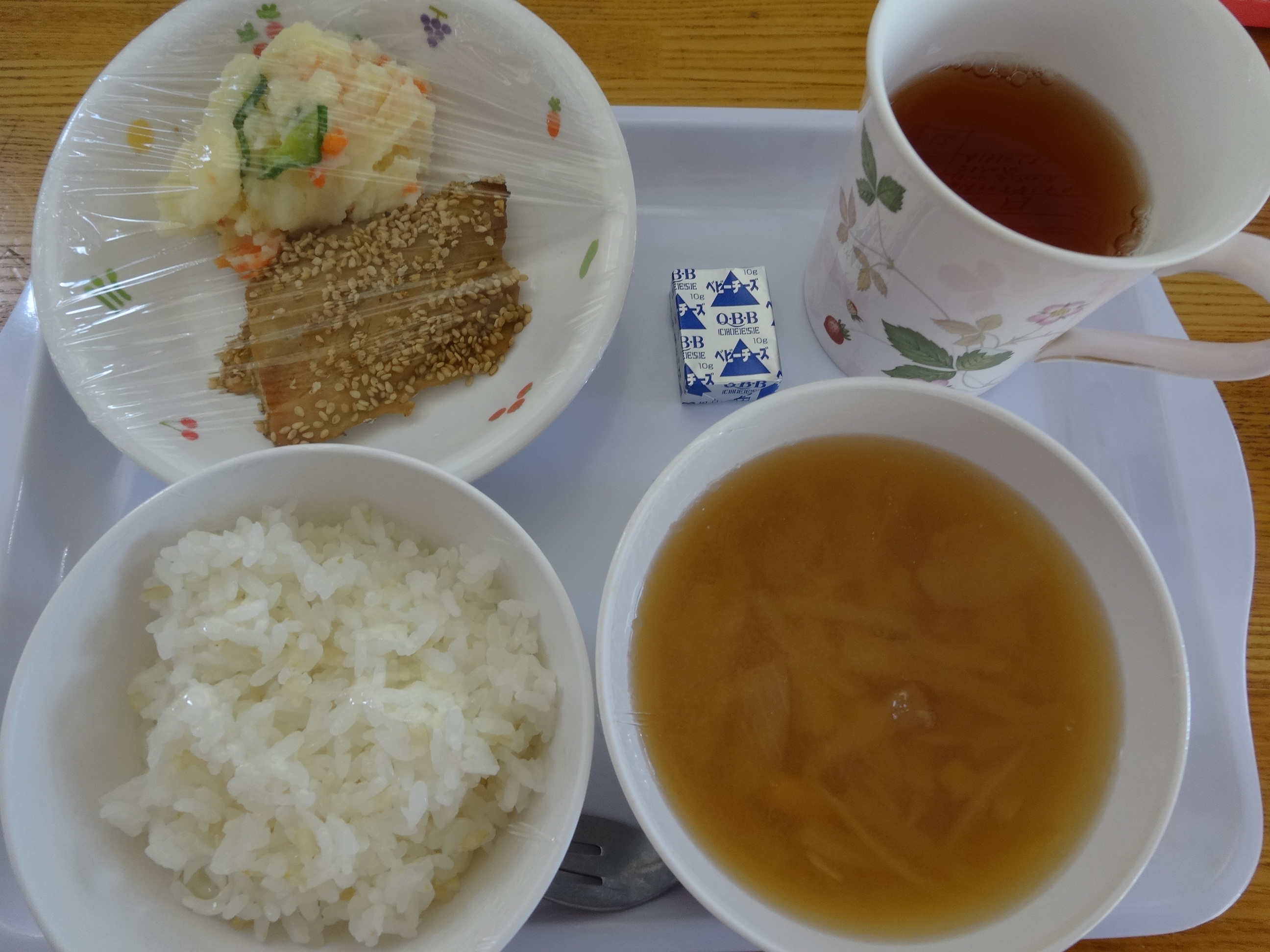 玄米入りごはん・味噌汁(高野豆腐・玉ねぎ・えのき)・さわらのゴマ照り焼き・ポテトサラダ・チーズ・麦茶
