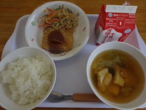 ご飯・味噌汁(厚揚げ・キャベツ・しめじ)・まぐろフライ・中華サラダ・麦茶