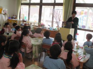 配膳前には,『花さき山』の絵本の読み聞かせを聞き,