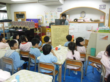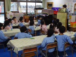 給食準備を終えると,園長先生が「花さき山」の絵本の読み聞かせをしてくれました。