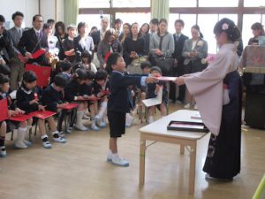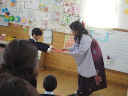 園長先生から証書をいただく子どもたちは,いつもよりたくましく見えました。