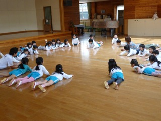 4月17日(水) 本日より、幼児体育の授業が始まりました。毎週水曜日、1クラス20分から30分。保育の中に幼児体育を取り入れています。4・5歳児は体育の近江先生(幼児体育研究所)と暫く振りにお会いするのを大変喜んでいました。3歳児のお子さん方は初めてですが、予想外に楽しんで体を動かしていました。回数を重ねながら、バランスの良い体づくりと体力の向上を願っています。
