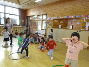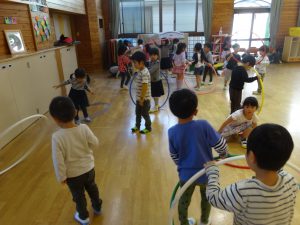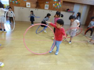 3歳児もお兄さんやお姉さんの真似をしながら、フープ遊びを楽しみました。