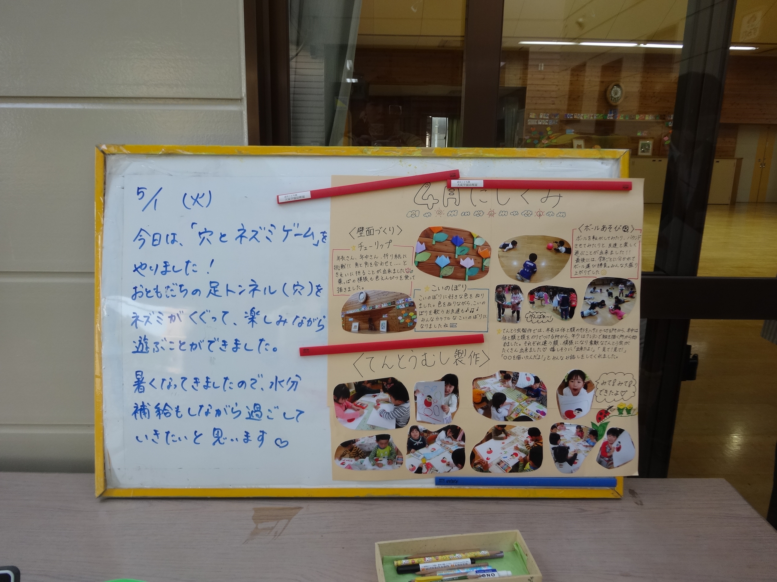 掲示板で元気に過ごしているにじ組の子どもたちを紹介しています。