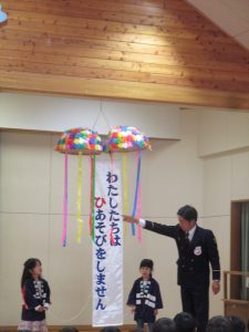 くす玉を割ると「わたしたちは火あそびをしません」の文字が出てきました。