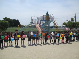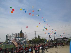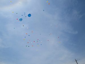 「わたしたちは火あそびをしません」の約束を込めて風船を飛ばしました。