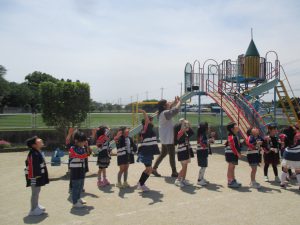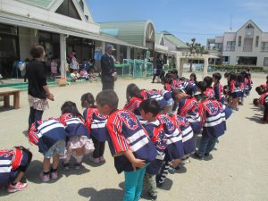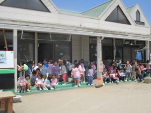 テラスから3・4歳児のクラスのお友達も一緒に見送りました。
