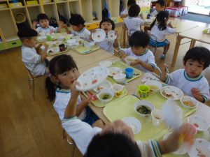 3歳児のクラスです。給食の時間も楽しみになりました。