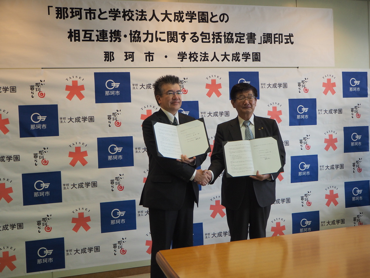 本学園(茨城女子短期大学・大成女子高等学校・認定こども園大成学園幼稚園・大成学園額田保育園)は、2018年6月28日那珂市役所において「那珂市と学校法人大成学園との相互連携・協力に関する包括協定書」に調印いたしました。