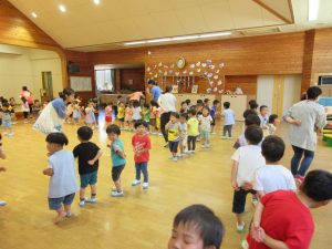今日は,3歳児と4歳児が一緒に遊戯室で練習をしていました。