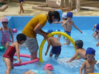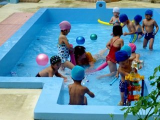 この2日間は、戻り梅雨? プール開放が中止となりました。けれども、本日は朝から気温とともに水温も上がり、待ちかねたプール遊びができました。水の気持ち良さに触れ、子どもも先生も楽しそうです。撮影しながら、「魚になりたいなぁ。」。