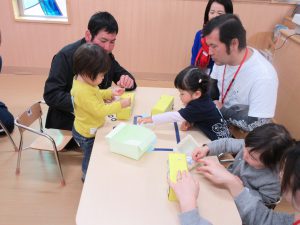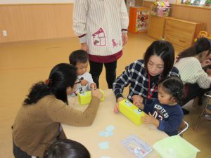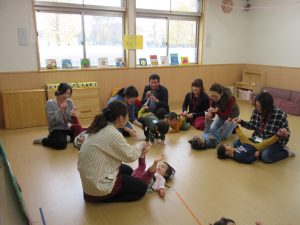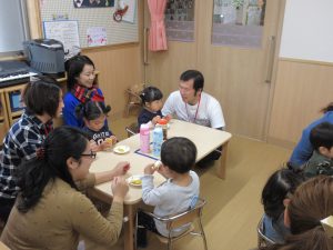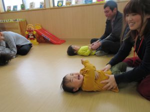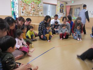 その後はお集りをし,「むすんでひらいて」や「手を叩きましょう」を,お父さんお母さんのお膝の上で行いました。