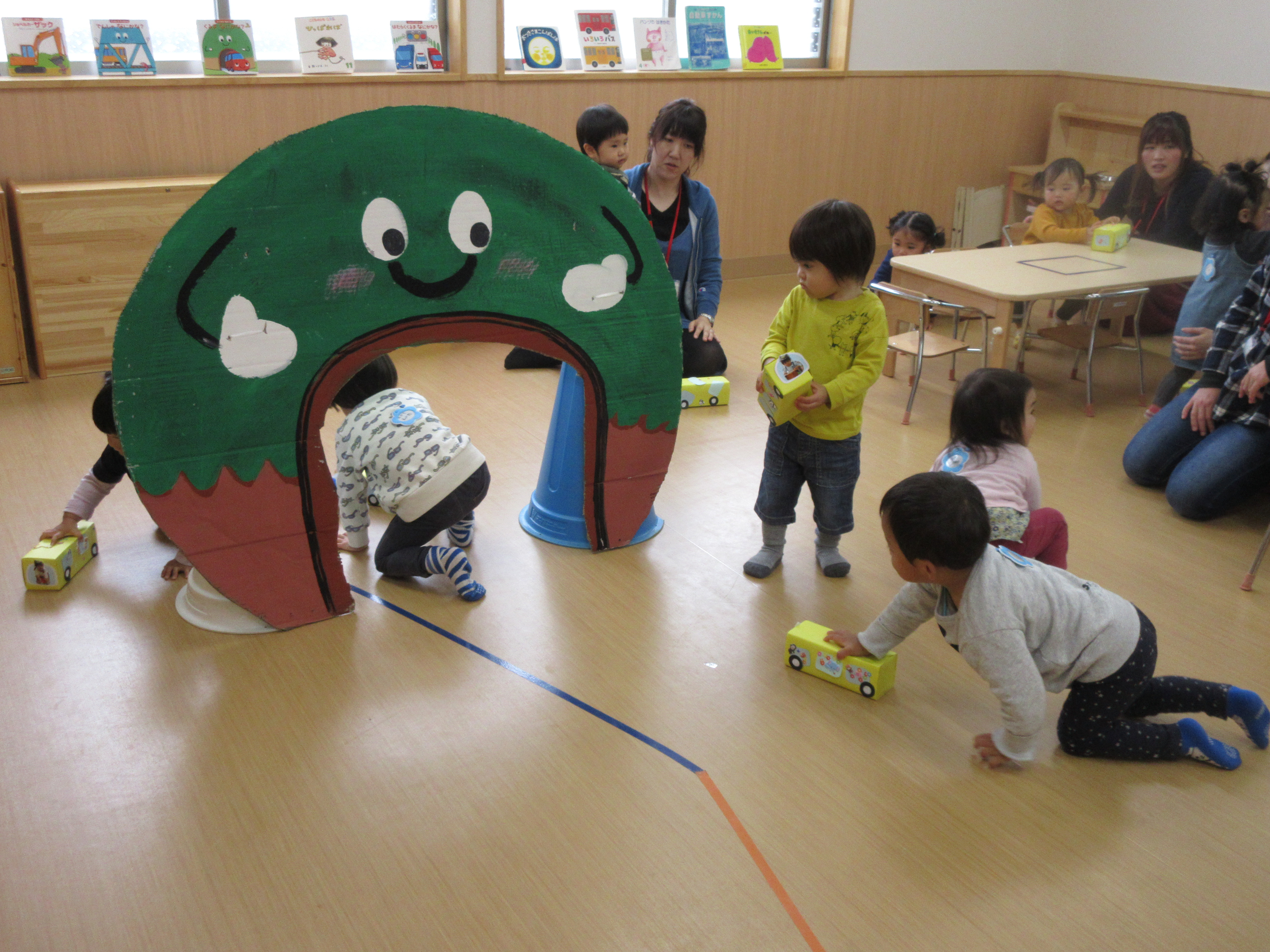 「ピーンポーン!」「トマリー!」と言いながら,トンネルのネルくんを潜って遊んでいました。