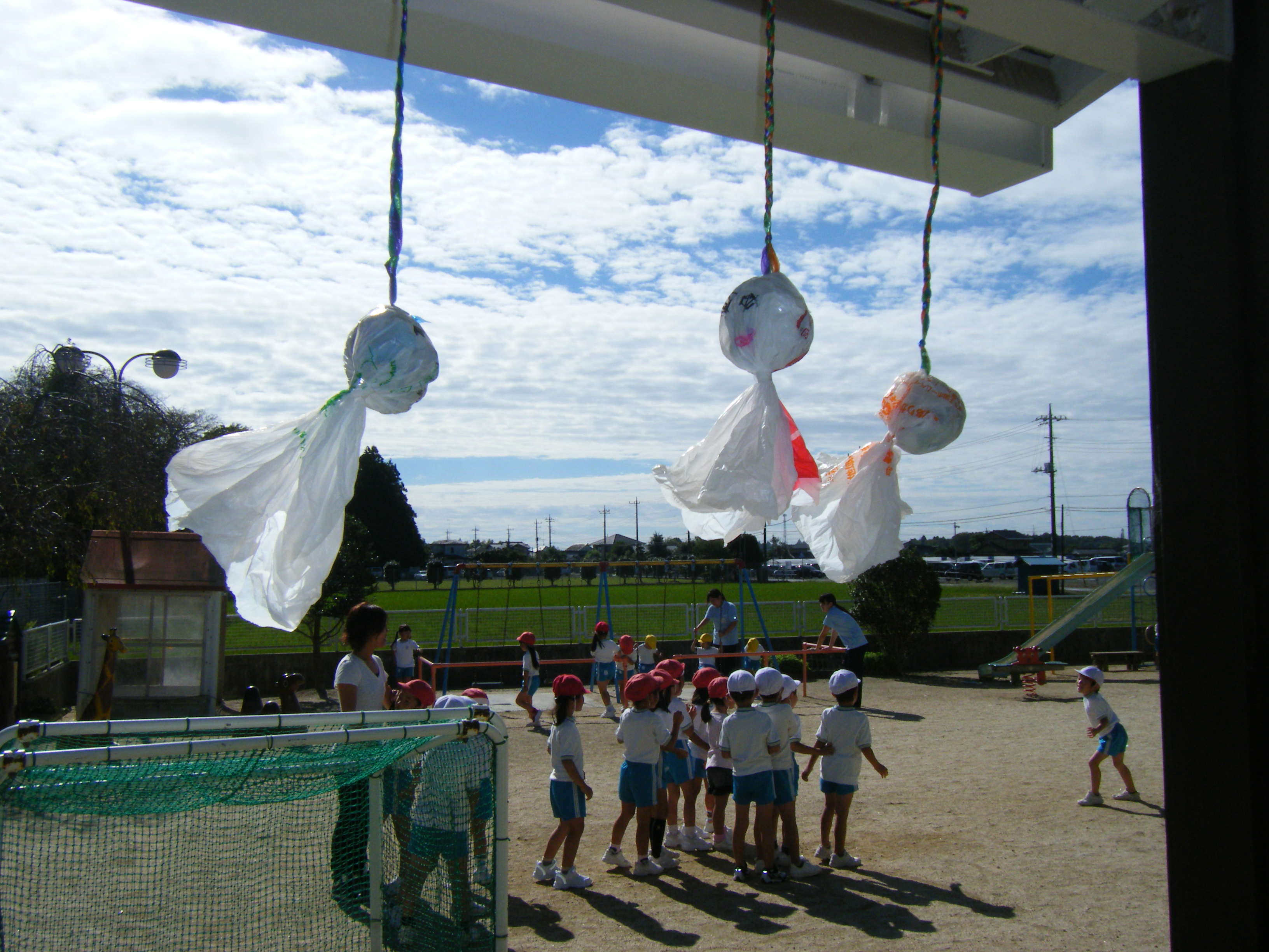 晴れることを願ってうめ組の前には、てるてるぼうずが並びました。
