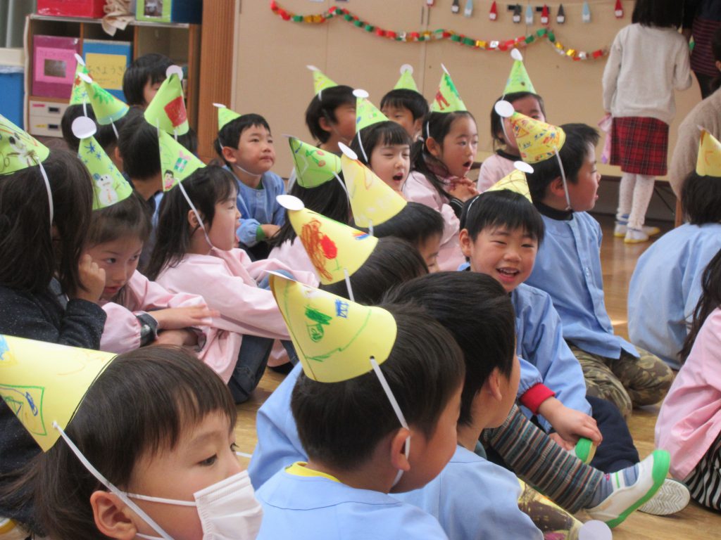 自分で作ったサンタの帽子を被って、クリスマス会が始まるのを楽しみにしています!