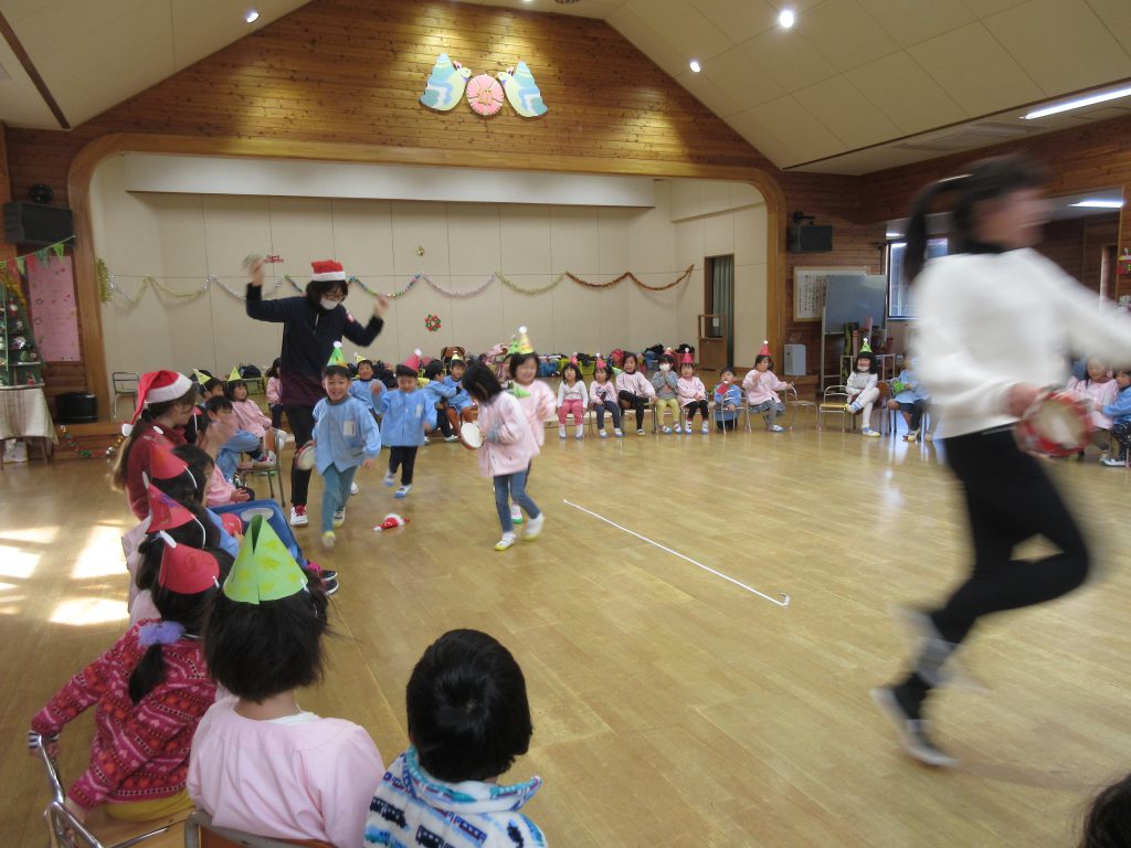 トナカイのクリスマスゲームで、ピアノの音楽に合わせて歌いながら、楽しく行いました。