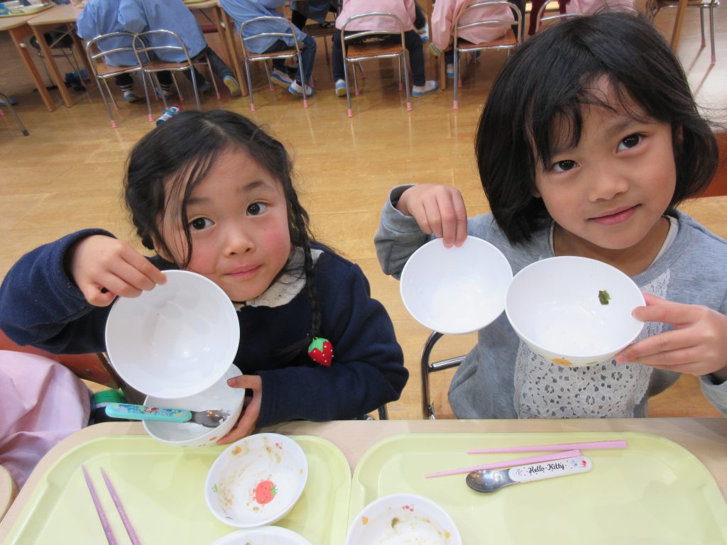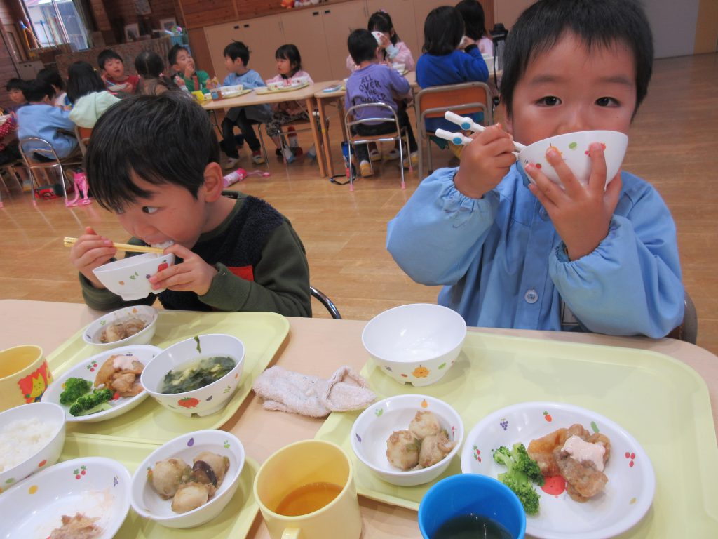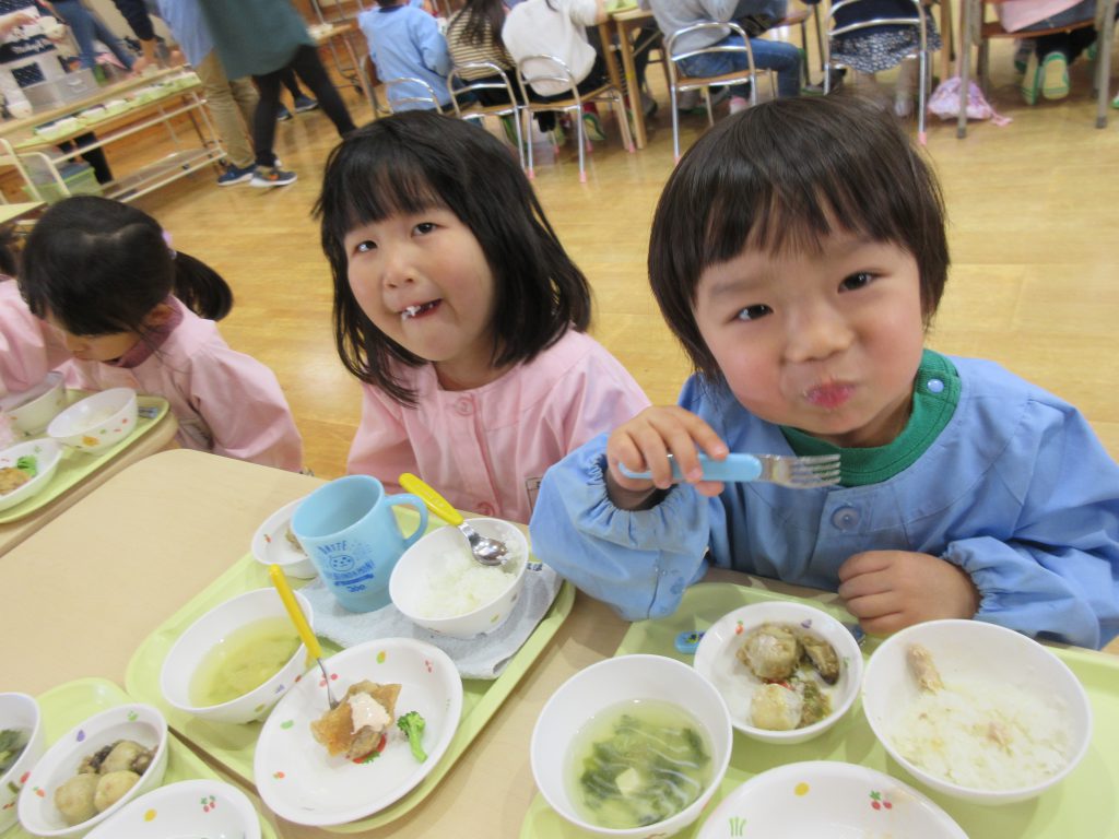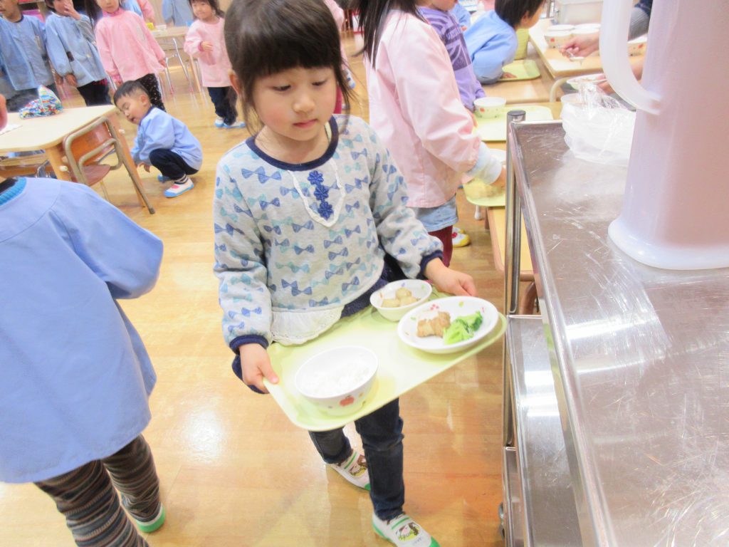 外でたくさん遊んだ後は給食の時間です。