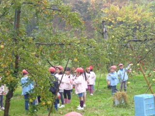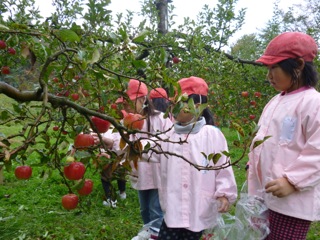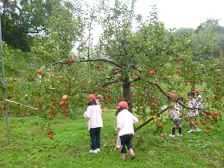 リンゴ園に到着 リンゴを頂きました。「おいしい!」短時間のうちにあれだけあつたリンゴがありません。子ども達の食欲には、驚きました。ひと時、雨も上がりました。「いまです!」「やりましょう!」「イェーイ!」