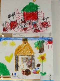 絵も描きました。子ども達は「さるかに合戦」のお話を聞きました。さるにいじわるをされた友達を助けようと、かに達が集まってきました。ハチは水瓶の中に、うすは天井に隠れて クリは火鉢の中に隠れて………「いたたたたぁ!」さるは降参しました。