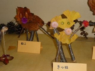 自然物を使って モミジやイチョウの葉の色づきが大変きれいです。なかなか面白い作品です。
