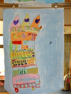絵を描きました。「100回建てのバス」こんなバスに乗ってみたいですね。どのような景色がみえるでしょう?