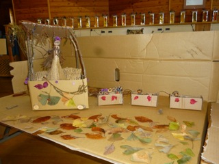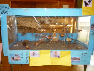 自然物を使って 友達と共同制作に取り組みました。いろいろなイメージが広がり、友達との会話を楽しみながら活動しました。「ディズニーランドのパレード」「水族館」が完成しました。