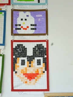 モザイク画 最近は集中力がついてきました。また、やり始めた作業を最後までやり遂げていく気持ちも強くなりました。一枚一枚丁寧に張り合わせていく作業の中で、少しずつ型が見えていきます。「ミッキーマウス」「ネコ」