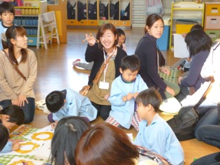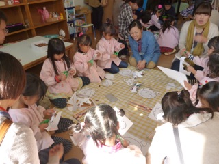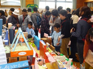子ども達の作品は、遊戯室に展示しました。おとうさん おかあさん方、大勢の方々に見て頂きました。子ども達は、自分の制作した作品の説明をしました。