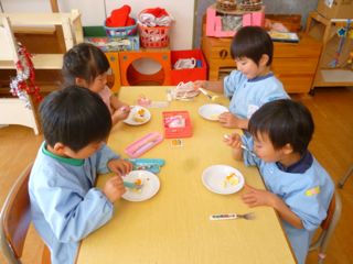本日は、クッキングデーです。(年2回) 子ども達とおやつを作りいただいています。本日作ったのは、ケーキです。クリームを伸ばし、みかんやアポロチョコ・アラザンで飾り付けをしてみました。とてもおいしそうなケーキがたくさんできました。「自分で作ったよ。」というのが、子ども達にとっては、大変自慢な様子です。私もいただきました。やさしい味わいのケーキでした。「子ども達が作ってくれたもの。」嬉しいです。
