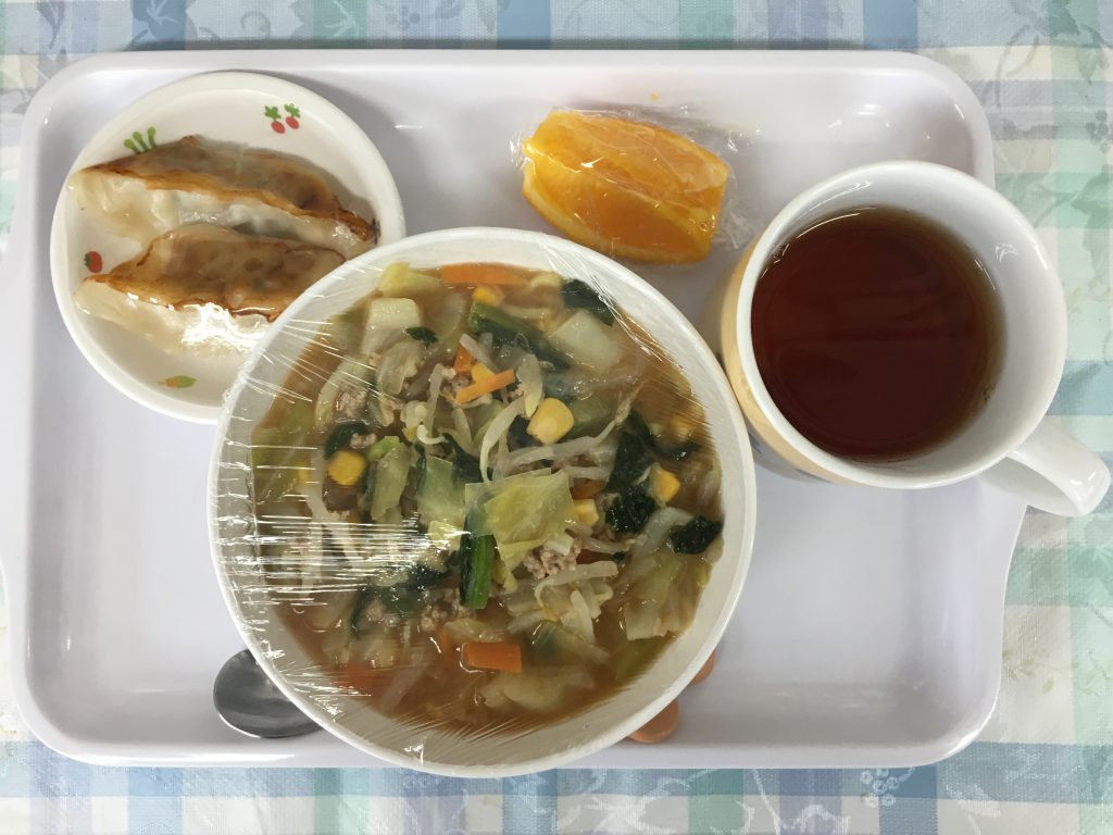 野菜たっぷり味噌ラーメン(豚肉・キャベツ・玉ねぎ・人参・もやし・小松菜・コーン)・餃子・オレンジ