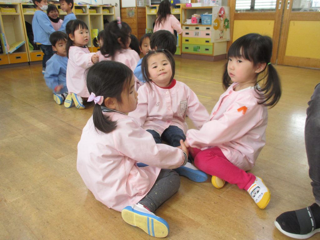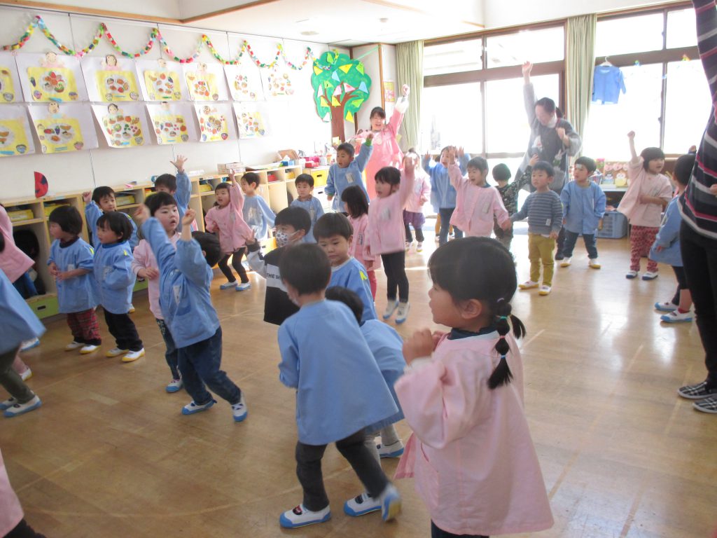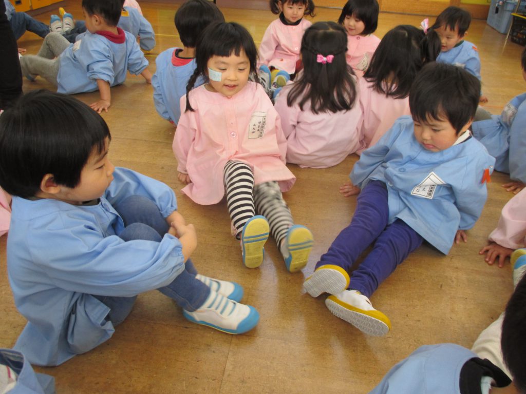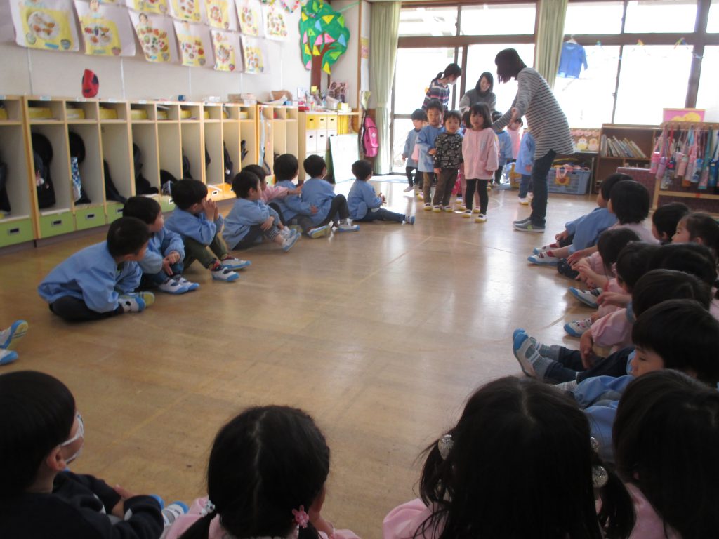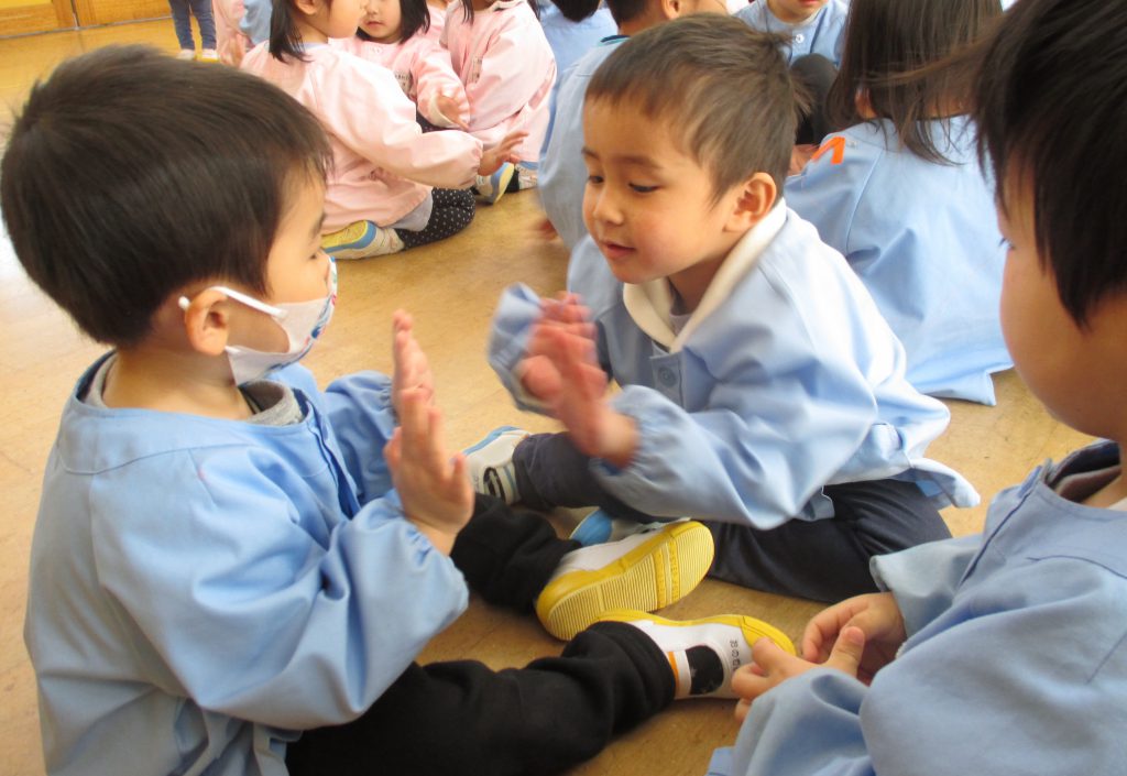 一緒に遊んだよ(2・3歳児) 2019 3/14 ニュース 2歳児・3歳児クラスの子どもたちが一緒に遊びました。2回目だったので,ワクワクする姿が見られました。 ちゅうりっぷさんが遊びに来てくれましたよ。 一緒に手を繋ごう! サンサン体操をみんなで踊りました。 幸せなら手をたたこう♪「パンパン」 幸せなら足ならそう♪「トントン」 お姉さんに手を繋いでもらって安心♡ 今度は一緒にお昼ご飯を食べようと話をし,次回の活動を楽しみにしている子どもたちです。 ニュース URLをコピーしました! お別れの集い(5歳児) お別れ会 コメント コメントする コメントをキャンセルコメント ※ 名前 ※ メール ※ サイト 次回のコメントで使用するためブラウザーに自分の名前、メールアドレス、サイトを保存する。 上に表示された文字を入力してください。 Δ