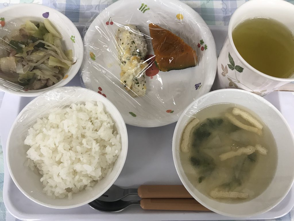 ご飯・白身魚のコーンクリーム煮・かぼちゃの甘煮・肉野菜炒め・みそ汁(大根・大根葉・油揚)