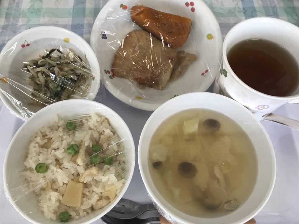 たけのこごはん・鶏肉の塩こうじ焼き・かぼちゃの甘煮・もやしとツナの塩昆布和え・みそ汁(キャベツ・しめじ・玉ねぎ)