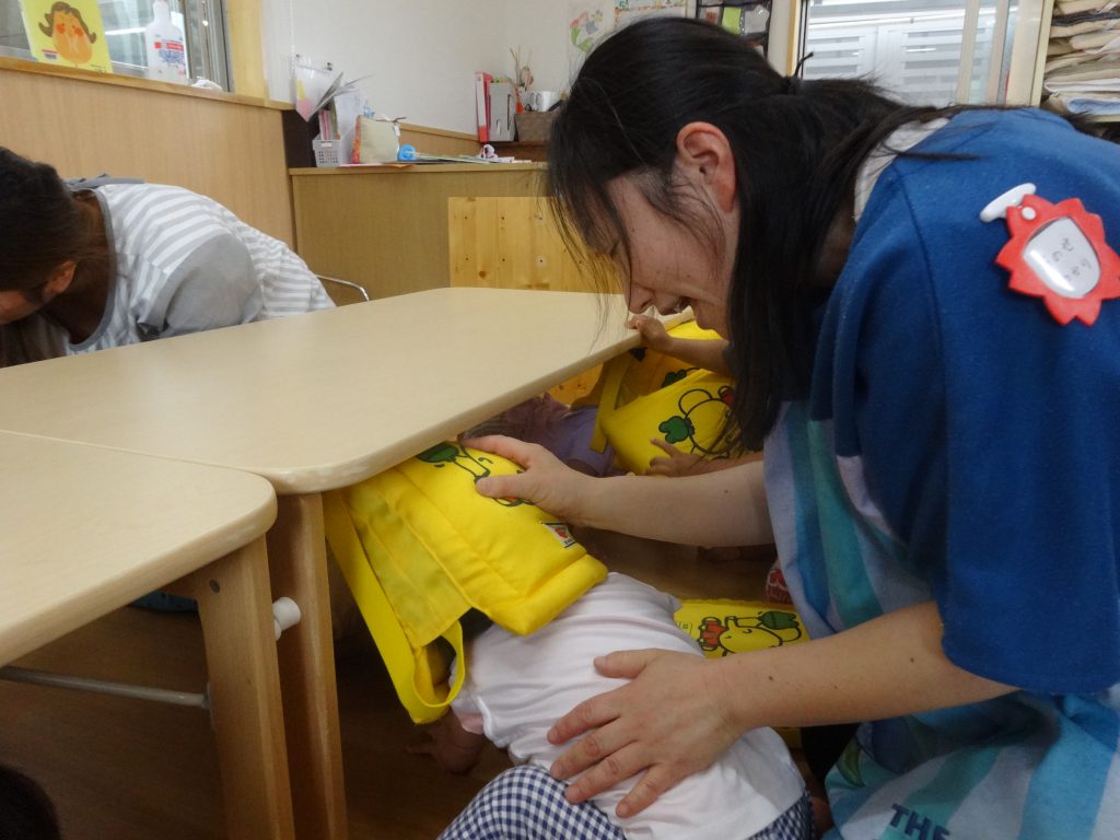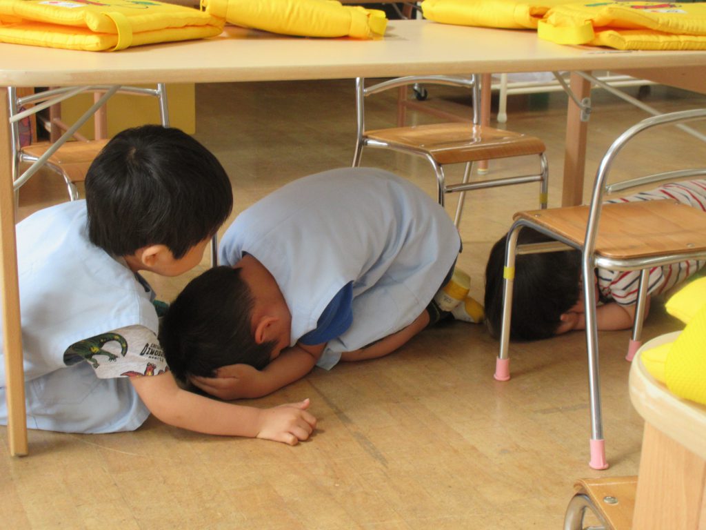 ちょっとびっくりしてしまった友達もいたようですが,放送や先生の話をよく聞いて,机の下に隠れたり,防災頭巾をかぶって頭を守ることができました。