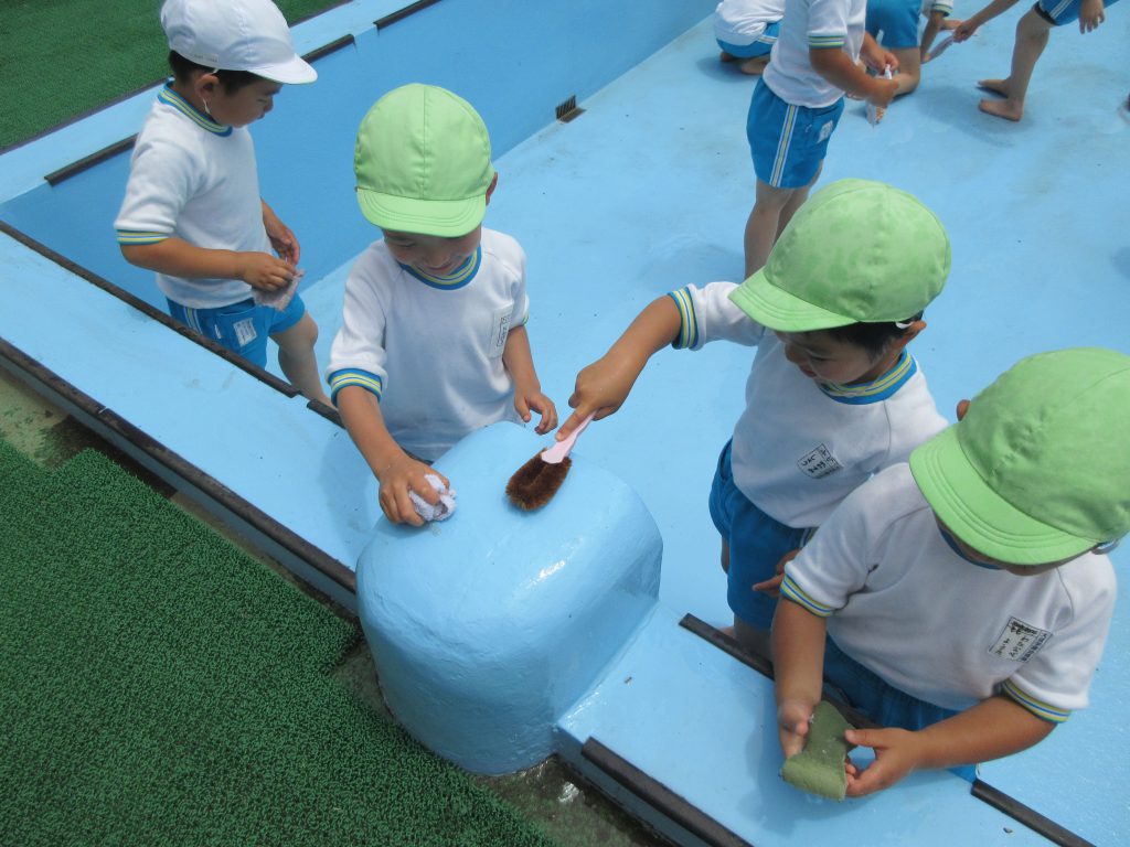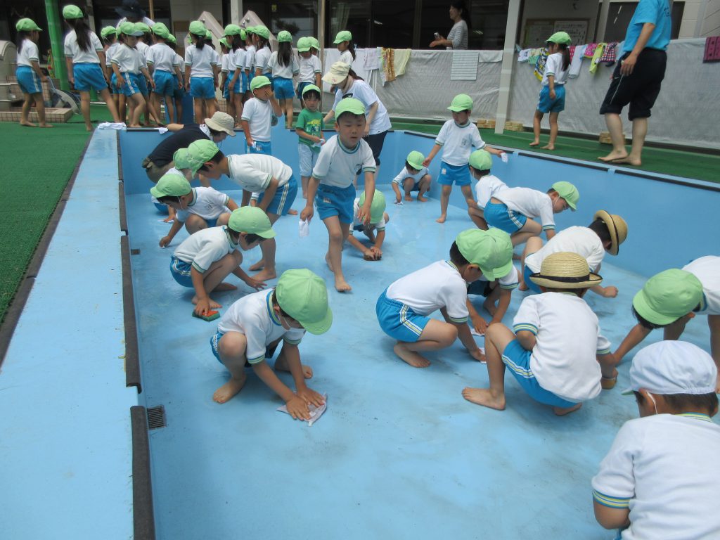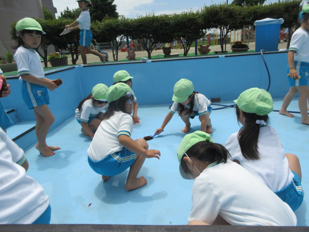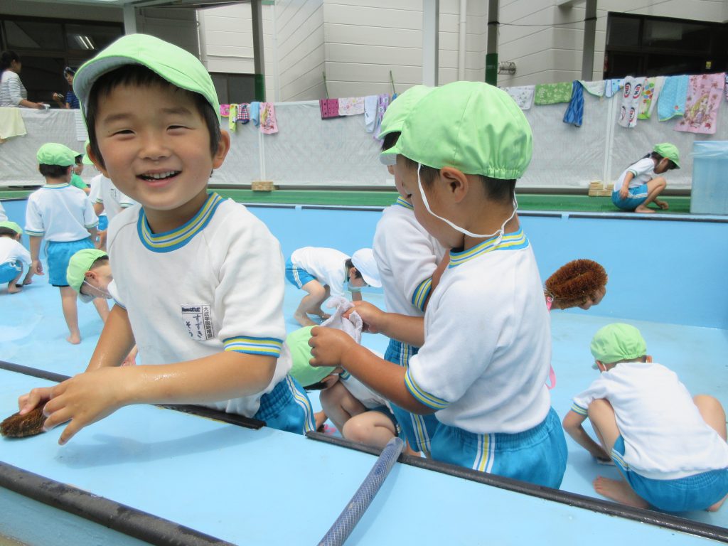本日はさくら組・ふじ組の子どもたちがプール清掃を行いました!