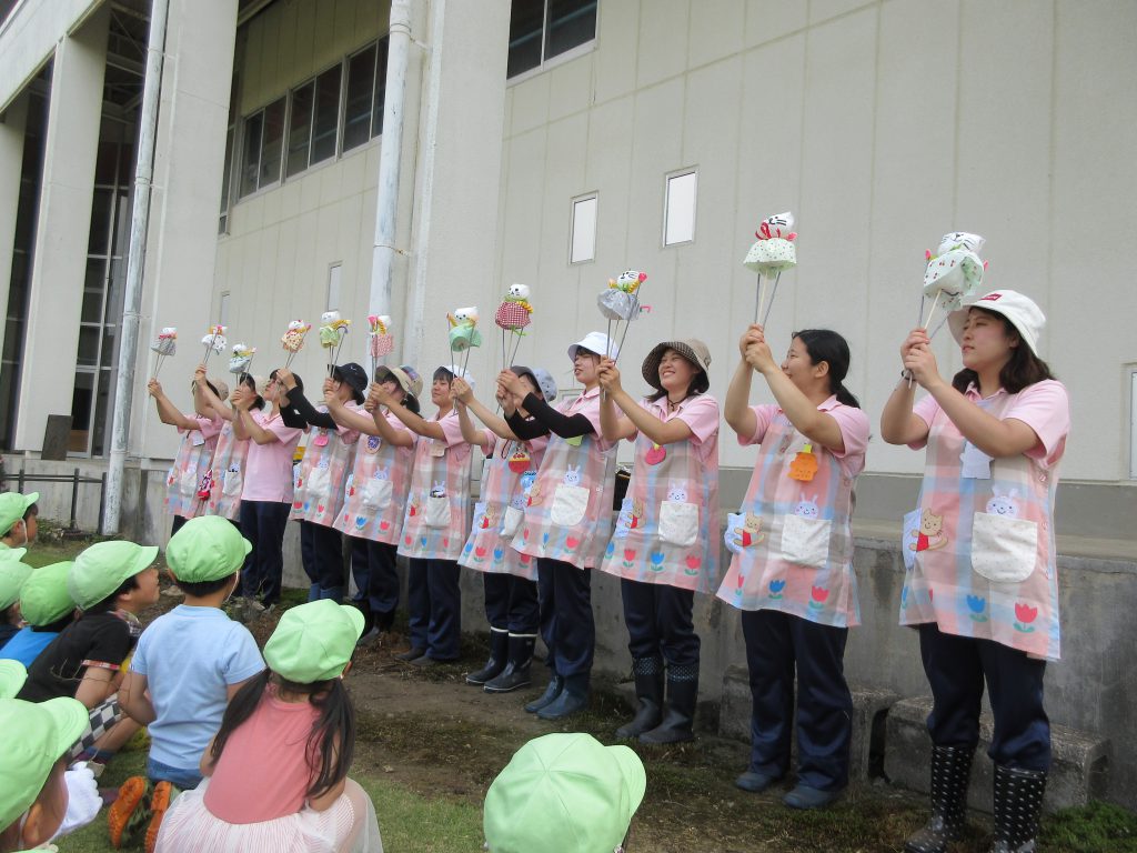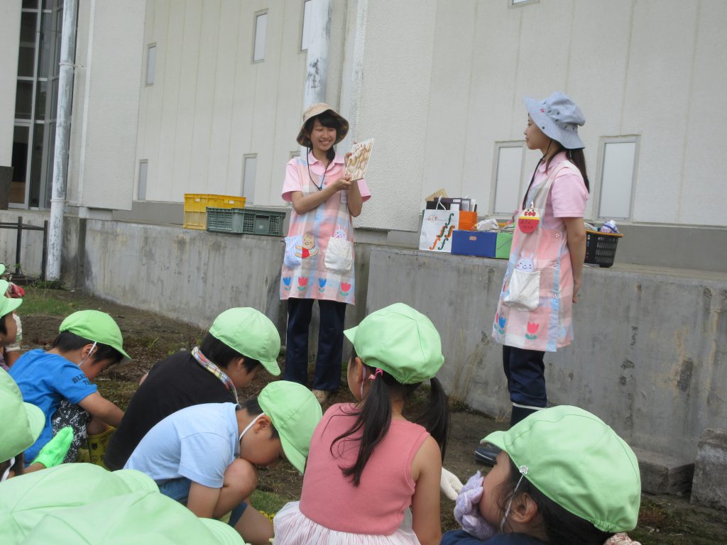 ジャガイモ掘りを短大の海野先生とお姉さん先生と一緒に行いました。