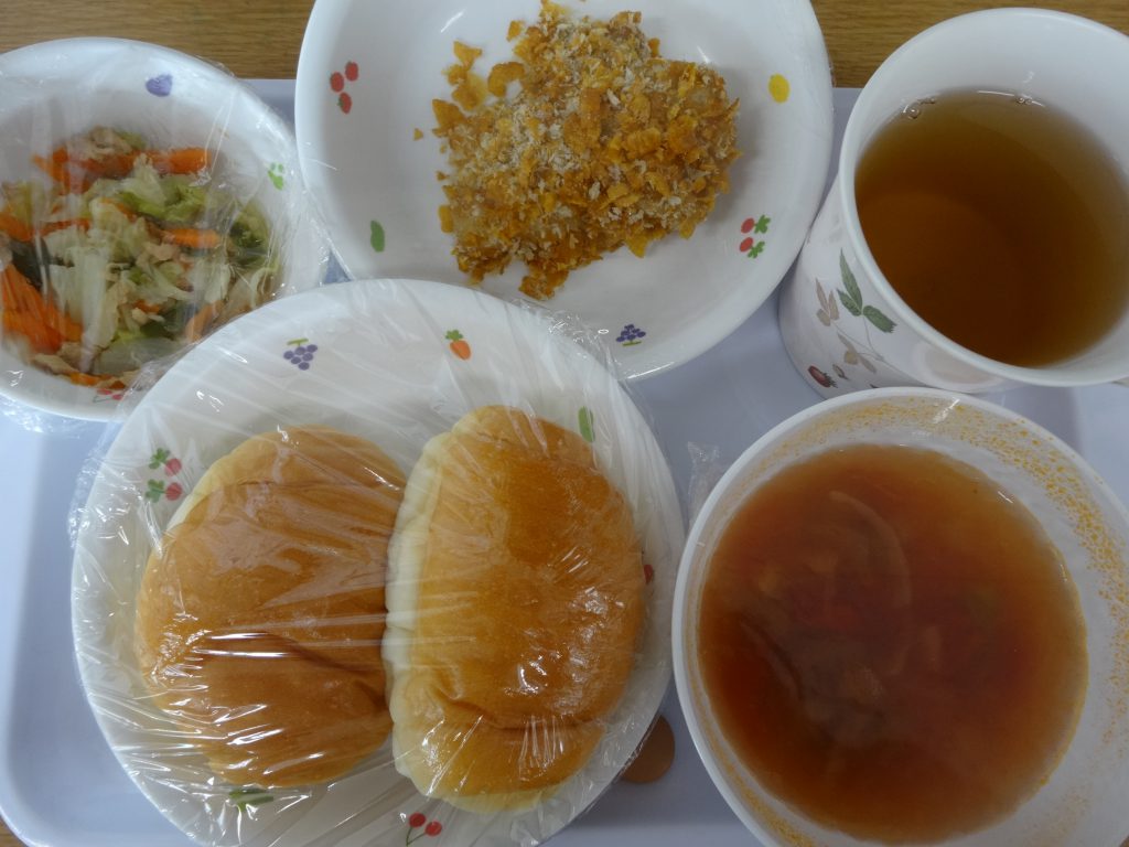 バタロール・サクサクチキン・ツナと野菜の炒め物・トマトスープ(玉ねぎ・セロリ・ベーコン・アスパラガス・トマト)